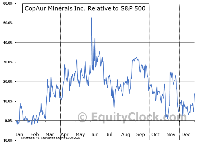 Analysis of the CopAur Minerals Inc. (TSXV:CPAU.V) seasonal charts above shows that a Buy Date of November 28 and a Sell Date of February 21 has resulted in a geometric average return of 8.8% above the benchmark rate of the S&P 500 Total Return Index over the past 15 years. This seasonal timeframe has shown positive results compared to the benchmark in 10 of those periods. This is a good rate of success and the return strongly outperforms the relative buy-and-hold performance of the stock over the past 15 years by an average of 48.55% per year.