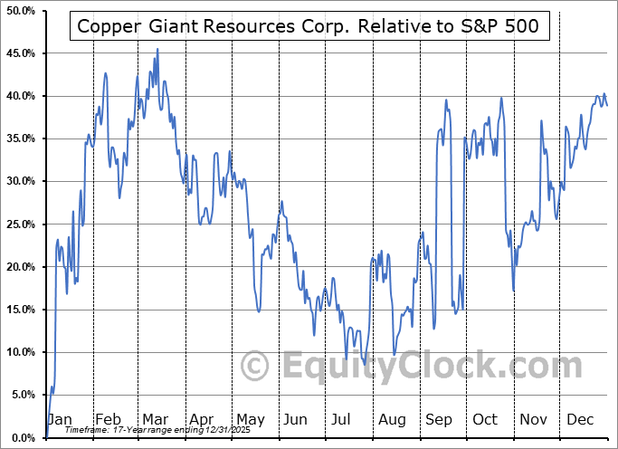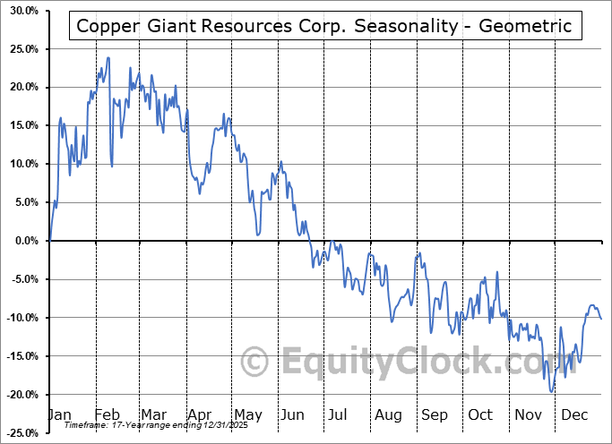 Analysis of the Copper Giant Resources Corp. (TSXV:CGNT.V) seasonal charts above shows that a Buy Date of November 29 and a Sell Date of February 24 has resulted in a geometric average return of 17.18% above the benchmark rate of the S&P 500 Total Return Index over the past 16 years. This seasonal timeframe has shown positive results compared to the benchmark in 12 of those periods. This is a good rate of success and the return strongly outperforms the relative buy-and-hold performance of the stock over the past 16 years by an average of 41.21% per year.