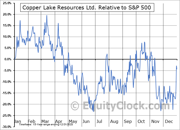 Analysis of the Copper Lake Resources Ltd. (TSXV:CPL.V) seasonal charts above shows that a Buy Date of December 22 and a Sell Date of March 13 has resulted in a geometric average return of 33.89% above the benchmark rate of the S&P 500 Total Return Index over the past 14 years. This seasonal timeframe has shown positive results compared to the benchmark in 11 of those periods. This is a good rate of success and the return strongly outperforms the relative buy-and-hold performance of the stock over the past 14 years by an average of 65.7% per year.