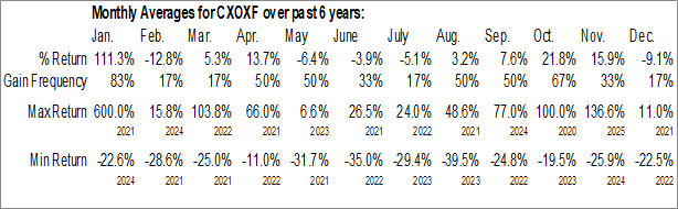 A word of caution: Only 6 years of data is available for shares of CXOXF, perhaps insufficient to create a seasonal profile that accurately gauges the seasonal tendencies influencing the investment. Ideally, while 20 years is preferred, at least 10 years of data is required to perform a seasonal analysis that is considered to be reliable for future seasonal periods.