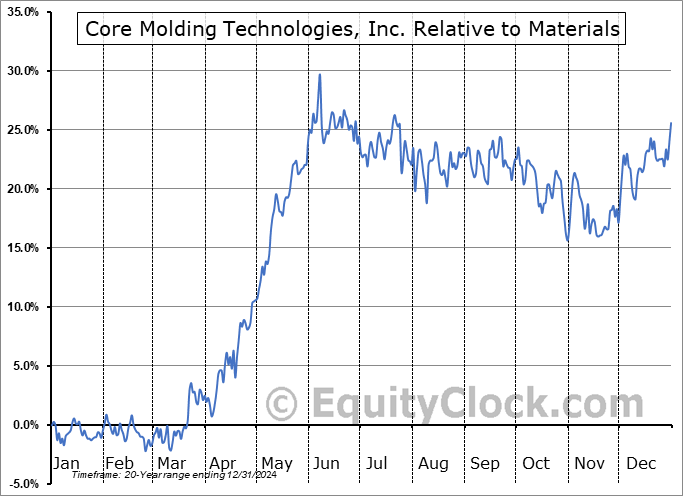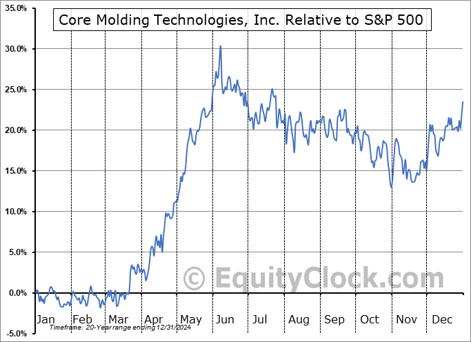 Analysis of the Core Molding Technologies, Inc. (AMEX:CMT) seasonal charts above shows that a Buy Date of April 16 and a Sell Date of July 29 has resulted in a geometric average return of 13.01% above the benchmark rate of the S&P 500 Total Return Index over the past 20 years. This seasonal timeframe has shown positive results compared to the benchmark in 16 of those periods. This is a very good rate of success and the return strongly outperforms the relative buy-and-hold performance of the stock over the past 20 years by an average of 13.78% per year.