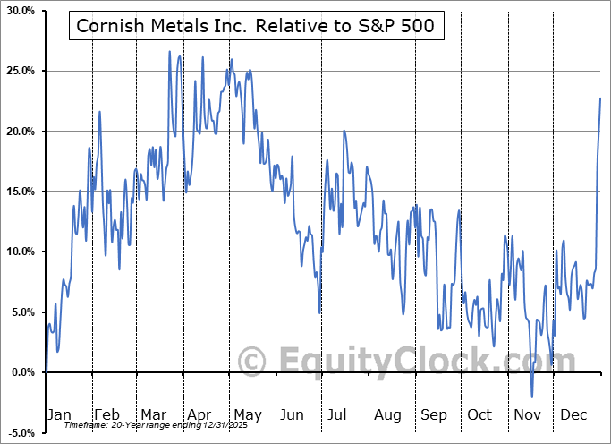 Analysis of the Cornish Metals Inc. (TSXV:CUSN.V) seasonal charts above shows that a Buy Date of December 11 and a Sell Date of March 10 has resulted in a geometric average return of 28.68% above the benchmark rate of the S&P 500 Total Return Index over the past 20 years. This seasonal timeframe has shown positive results compared to the benchmark in 17 of those periods. This is a very good rate of success and the return strongly outperforms the relative buy-and-hold performance of the stock over the past 20 years by an average of 51.25% per year.