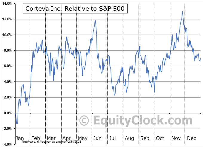 Analysis of the Corteva Inc. (NYSE:CTVA) seasonal charts above shows that a Buy Date of December 13 and a Sell Date of March 4 has resulted in a geometric average return of 9.76% above the benchmark rate of the S&P 500 Total Return Index over the past 5 years. This seasonal timeframe has shown positive results compared to the benchmark in 5 of those periods. This is an excellent rate of success and the return strongly outperforms the relative buy-and-hold performance of the stock over the past 5 years by an average of 8.01% per year.