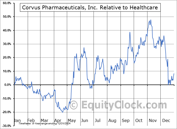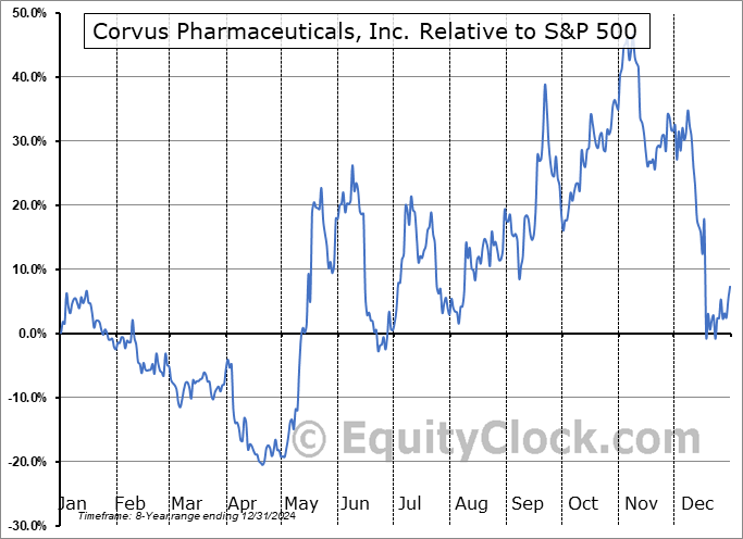 Analysis of the Corvus Pharmaceuticals, Inc. (NASD:CRVS) seasonal charts above shows that a Buy Date of April 19 and a Sell Date of July 8 has resulted in a geometric average return of 31.29% above the benchmark rate of the S&P 500 Total Return Index over the past 8 years. This seasonal timeframe has shown positive results compared to the benchmark in 6 of those periods. This is a good rate of success and the return strongly outperforms the relative buy-and-hold performance of the stock over the past 8 years by an average of 54.19% per year.