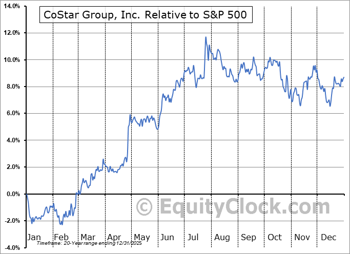 Analysis of the CoStar Group, Inc. (NASD:CSGP) seasonal charts above shows that a Buy Date of March 2 and a Sell Date of June 23 has resulted in a geometric average return of 6.96% above the benchmark rate of the S&P 500 Total Return Index over the past 20 years. This seasonal timeframe has shown positive results compared to the benchmark in 18 of those periods. This is an excellent rate of success and the return strongly outperforms the relative buy-and-hold performance of the stock over the past 20 years by an average of 3.57% per year.