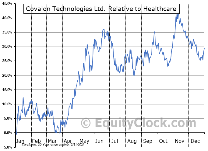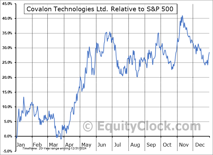Analysis of the Covalon Technologies Ltd. (TSXV:COV.V) seasonal charts above shows that a Buy Date of March 26 and a Sell Date of June 17 has resulted in a geometric average return of 15.93% above the benchmark rate of the S&P 500 Total Return Index over the past 20 years. This seasonal timeframe has shown positive results compared to the benchmark in 14 of those periods. This is a good rate of success and the return strongly outperforms the relative buy-and-hold performance of the stock over the past 20 years by an average of 26.26% per year.