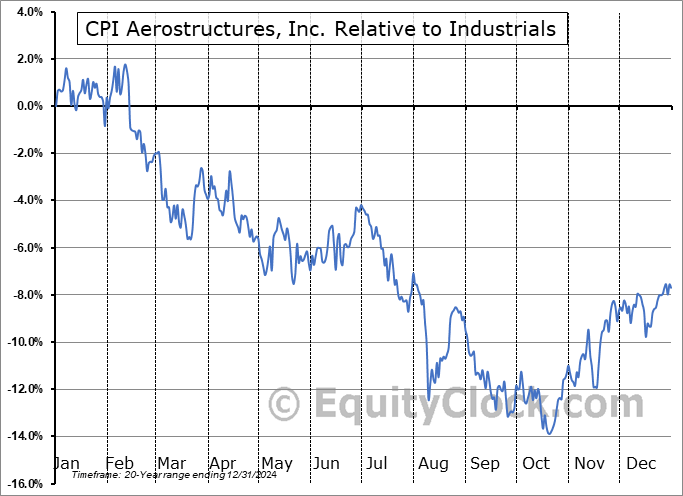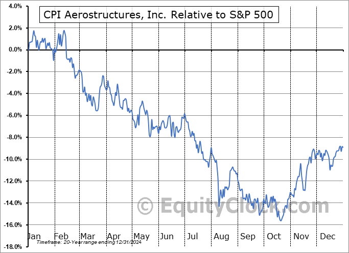 Analysis of the CPI Aerostructures, Inc. (NYSE:CVU) seasonal charts above shows that a Buy Date of October 23 and a Sell Date of February 3 has resulted in a geometric average return of 7.23% above the benchmark rate of the S&P 500 Total Return Index over the past 20 years. This seasonal timeframe has shown positive results compared to the benchmark in 14 of those periods. This is a good rate of success and the return strongly outperforms the relative buy-and-hold performance of the stock over the past 20 years by an average of 21.14% per year.