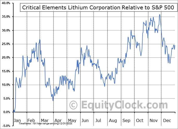 Analysis of the Critical Elements Lithium Corporation (TSXV:CRE.V) seasonal charts above shows that a Buy Date of August 8 and a Sell Date of October 27 has resulted in a geometric average return of 17.61% above the benchmark rate of the S&P 500 Total Return Index over the past 18 years. This seasonal timeframe has shown positive results compared to the benchmark in 13 of those periods. This is a good rate of success and the return strongly outperforms the relative buy-and-hold performance of the stock over the past 18 years by an average of 23.88% per year.