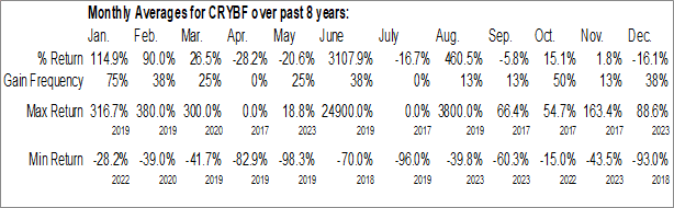 A word of caution: Only 8 years of data is available for shares of CRYBF, perhaps insufficient to create a seasonal profile that accurately gauges the seasonal tendencies influencing the investment. Ideally, while 20 years is preferred, at least 10 years of data is required to perform a seasonal analysis that is considered to be reliable for future seasonal periods.