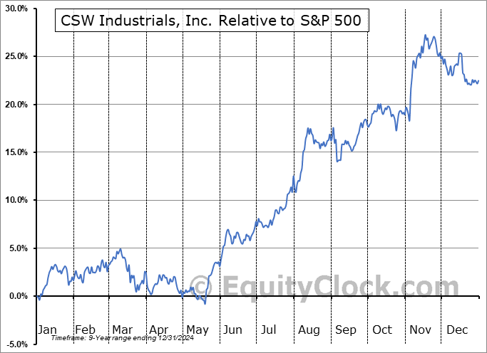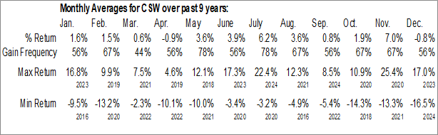 A word of caution: Only 9 years of data is available for shares of CSW, perhaps insufficient to create a seasonal profile that accurately gauges the seasonal tendencies influencing the investment. Ideally, while 20 years is preferred, at least 10 years of data is required to perform a seasonal analysis that is considered to be reliable for future seasonal periods.
