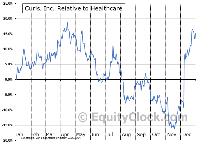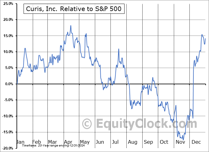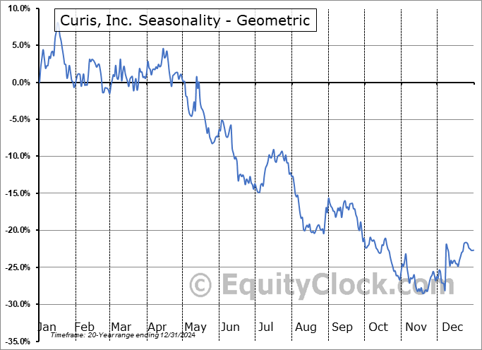Analysis of the Curis, Inc. (NASD:CRIS) seasonal charts above shows that a Buy Date of November 6 and a Sell Date of March 25 has resulted in a geometric average return of 6.92% above the benchmark rate of the S&P 500 Total Return Index over the past 20 years. This seasonal timeframe has shown positive results compared to the benchmark in 12 of those periods. This is a fair rate of success and the return strongly outperforms the relative buy-and-hold performance of the stock over the past 20 years by an average of 36.5% per year.