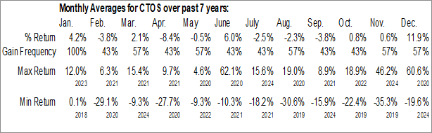A word of caution: Only 7 years of data is available for shares of CTOS, perhaps insufficient to create a seasonal profile that accurately gauges the seasonal tendencies influencing the investment. Ideally, while 20 years is preferred, at least 10 years of data is required to perform a seasonal analysis that is considered to be reliable for future seasonal periods.