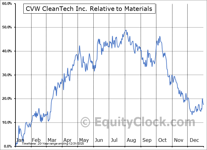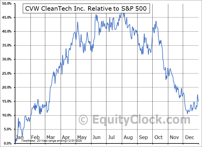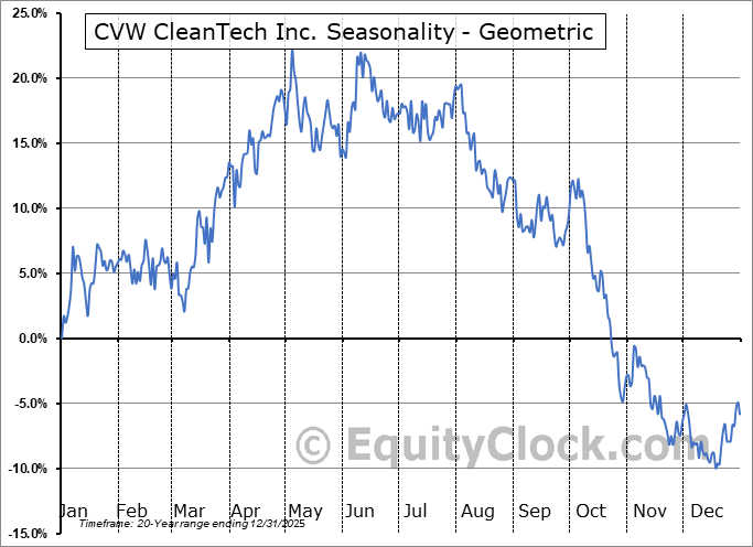 Analysis of the CVW CleanTech Inc. (TSXV:CVW.V) seasonal charts above shows that a Buy Date of November 25 and a Sell Date of March 28 has resulted in a geometric average return of 13.88% above the benchmark rate of the S&P 500 Total Return Index over the past 20 years. This seasonal timeframe has shown positive results compared to the benchmark in 13 of those periods. This is a good rate of success and the return strongly outperforms the relative buy-and-hold performance of the stock over the past 20 years by an average of 28.79% per year.