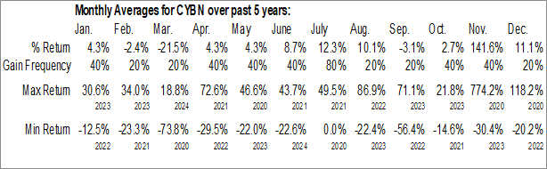 A word of caution: Only 5 years of data is available for shares of CYBN, perhaps insufficient to create a seasonal profile that accurately gauges the seasonal tendencies influencing the investment. Ideally, while 20 years is preferred, at least 10 years of data is required to perform a seasonal analysis that is considered to be reliable for future seasonal periods.
