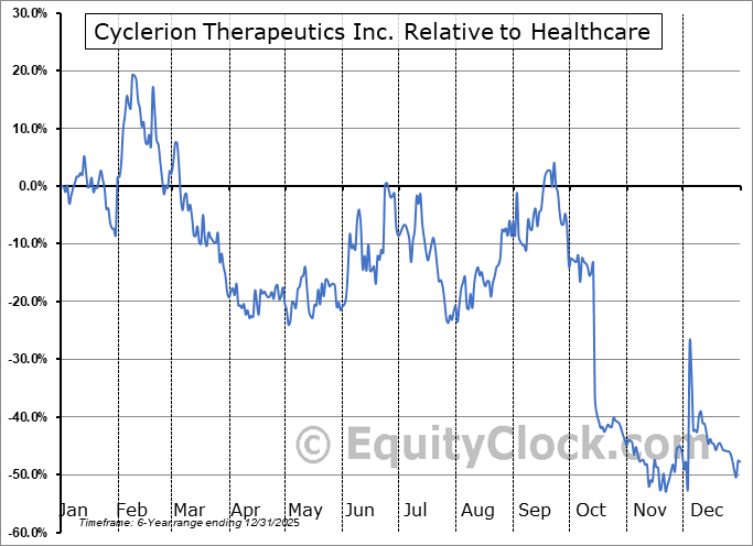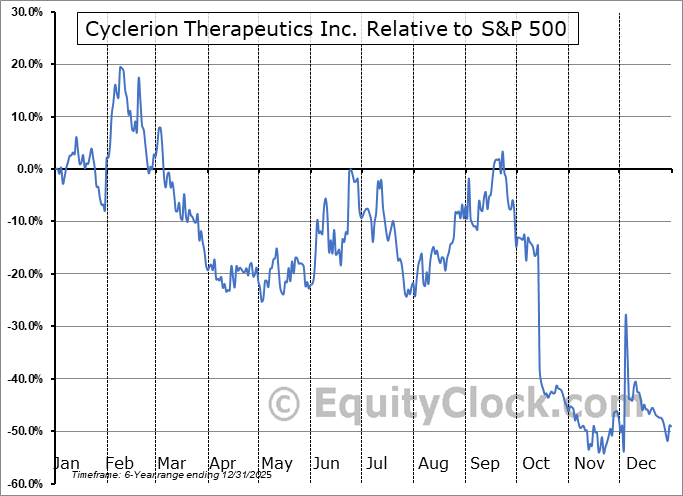 Analysis of the Cyclerion Therapeutics Inc. (NASD:CYCN) seasonal charts above shows that a Buy Date of November 18 and a Sell Date of February 9 has resulted in a geometric average return of 29.69% above the benchmark rate of the S&P 500 Total Return Index over the past 5 years. This seasonal timeframe has shown positive results compared to the benchmark in 4 of those periods. This is a very good rate of success and the return strongly outperforms the relative buy-and-hold performance of the stock over the past 5 years by an average of 79.02% per year.