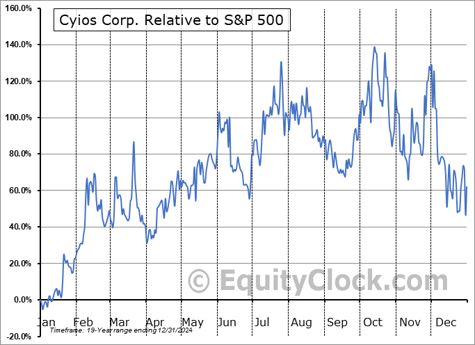 Analysis of the Cyios Corp. (OTCMKT:CYIO) seasonal charts above shows that a Buy Date of January 7 and a Sell Date of May 24 has resulted in a geometric average return of 42.09% above the benchmark rate of the S&P 500 Total Return Index over the past 19 years. This seasonal timeframe has shown positive results compared to the benchmark in 14 of those periods. This is a good rate of success and the return strongly outperforms the relative buy-and-hold performance of the stock over the past 19 years by an average of 72.96% per year.