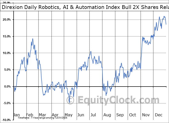 Analysis of the Direxion Daily Robotics, AI & Automation Index Bull 2X Shares (AMEX:UBOT) seasonal charts above shows that a Buy Date of August 20 and a Sell Date of December 8 has resulted in a geometric average return of 11.56% above the benchmark rate of the S&P 500 Total Return Index over the past 7 years. This seasonal timeframe has shown positive results compared to the benchmark in 6 of those periods. This is a very good rate of success and the return strongly outperforms the relative buy-and-hold performance of the stock over the past 7 years by an average of 15.29% per year.