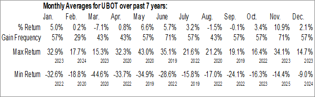 A word of caution: Only 7 years of data is available for shares of UBOT, perhaps insufficient to create a seasonal profile that accurately gauges the seasonal tendencies influencing the investment. Ideally, while 20 years is preferred, at least 10 years of data is required to perform a seasonal analysis that is considered to be reliable for future seasonal periods.