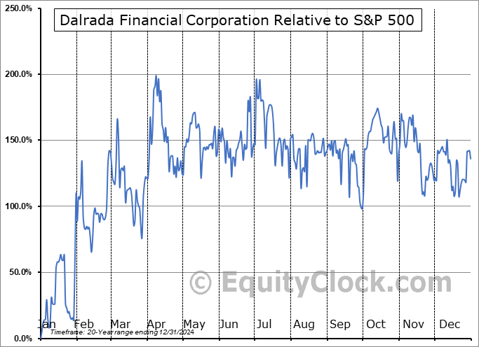 Analysis of the Dalrada Financial Corporation (OTCMKT:DFCO) seasonal charts above shows that a Buy Date of August 5 and a Sell Date of October 27 has resulted in a geometric average return of 28.76% above the benchmark rate of the S&P 500 Total Return Index over the past 20 years. This seasonal timeframe has shown positive results compared to the benchmark in 15 of those periods. This is a good rate of success and the return strongly outperforms the relative buy-and-hold performance of the stock over the past 20 years by an average of 45.9% per year.