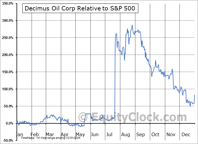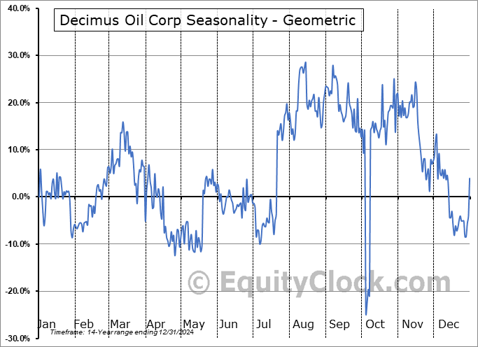 Analysis of the Decimus Oil Corp (TSXV:WCSB.V) seasonal charts above shows that a Buy Date of July 6 and a Sell Date of November 14 has resulted in a geometric average return of 29.98% above the benchmark rate of the S&P 500 Total Return Index over the past 13 years. This seasonal timeframe has shown positive results compared to the benchmark in 10 of those periods. This is a good rate of success and the return strongly outperforms the relative buy-and-hold performance of the stock over the past 13 years by an average of 38% per year.