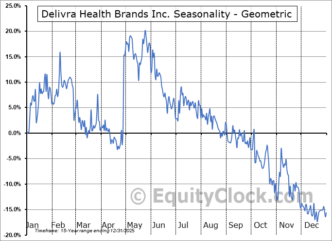 Analysis of the Delivra Health Brands Inc. (TSXV:DHB.V) seasonal charts above shows that a Buy Date of November 30 and a Sell Date of March 13 has resulted in a geometric average return of 0.41% above the benchmark rate of the S&P 500 Total Return Index over the past 14 years. This seasonal timeframe has shown positive results compared to the benchmark in 8 of those periods. This is a fair rate of success and the return strongly outperforms the relative buy-and-hold performance of the stock over the past 14 years by an average of 27.81% per year.
