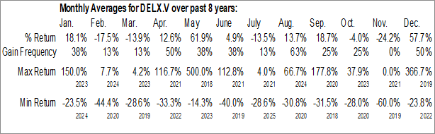 To download DELX.V seasonal chart data, please log in or Subscribe.