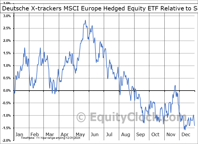 Analysis of the Deutsche X-trackers MSCI Europe Hedged Equity ETF (AMEX:DBEU) seasonal charts above shows that a Buy Date of February 10 and a Sell Date of May 21 has resulted in a geometric average return of 2.2% above the benchmark rate of the S&P 500 Total Return Index over the past 11 years. This seasonal timeframe has shown positive results compared to the benchmark in 9 of those periods. This is a very good rate of success and the return strongly outperforms the relative buy-and-hold performance of the stock over the past 11 years by an average of 6.9% per year.