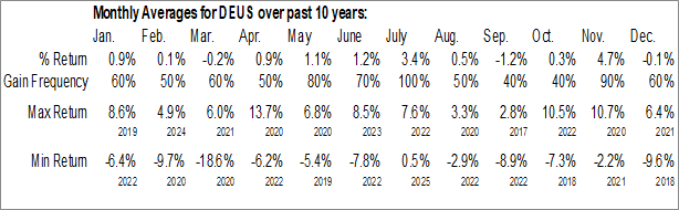 A word of caution: Only 9 years of data is available for shares of DEUS, perhaps insufficient to create a seasonal profile that accurately gauges the seasonal tendencies influencing the investment. Ideally, while 20 years is preferred, at least 10 years of data is required to perform a seasonal analysis that is considered to be reliable for future seasonal periods.