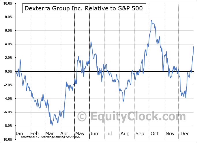 Analysis of the Dexterra Group Inc. (TSE:DXT.TO) seasonal charts above shows that a Buy Date of March 23 and a Sell Date of June 11 has resulted in a geometric average return of 11.16% above the benchmark rate of the S&P 500 Total Return Index over the past 18 years. This seasonal timeframe has shown positive results compared to the benchmark in 14 of those periods. This is a good rate of success and the return strongly outperforms the relative buy-and-hold performance of the stock over the past 18 years by an average of 21.18% per year.