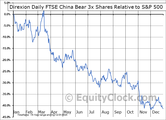 Analysis of the Direxion Daily FTSE China Bear 3x Shares (AMEX:YANG) seasonal charts above shows that a Buy Date of February 17 and a Sell Date of May 24 has resulted in a geometric average return of 0.85% above the benchmark rate of the S&P 500 Total Return Index over the past 14 years. This seasonal timeframe has shown positive results compared to the benchmark in 8 of those periods. This is a fair rate of success and the return strongly outperforms the relative buy-and-hold performance of the stock over the past 14 years by an average of 42.75% per year.