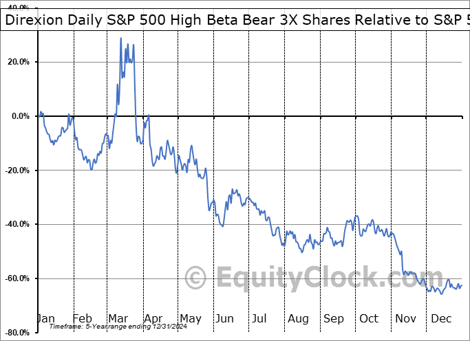 Analysis of the Direxion Daily S&P 500 High Beta Bear 3X Shares (AMEX:HIBS) seasonal charts above shows that a Buy Date of June 8 and a Sell Date of September 30 has resulted in a geometric average return of 6.78% above the benchmark rate of the S&P 500 Total Return Index over the past 5 years. This seasonal timeframe has shown positive results compared to the benchmark in 4 of those periods. This is a very good rate of success and the return strongly outperforms the relative buy-and-hold performance of the stock over the past 5 years by an average of 76.14% per year.