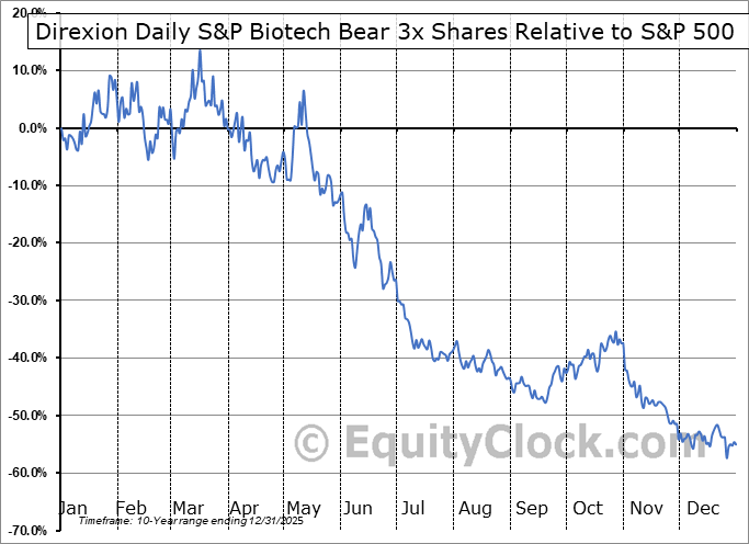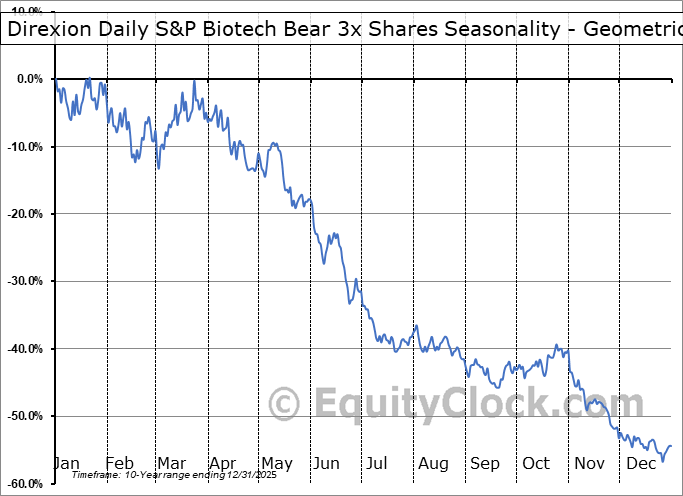 Analysis of the Direxion Daily S&P Biotech Bear 3x Shares (AMEX:LABD) seasonal charts above shows that a Buy Date of December 26 and a Sell Date of March 28 has resulted in a geometric average return of 1.55% above the benchmark rate of the S&P 500 Total Return Index over the past 10 years. This seasonal timeframe has shown positive results compared to the benchmark in 6 of those periods. This is a fair rate of success and the return strongly outperforms the relative buy-and-hold performance of the stock over the past 10 years by an average of 61.74% per year.