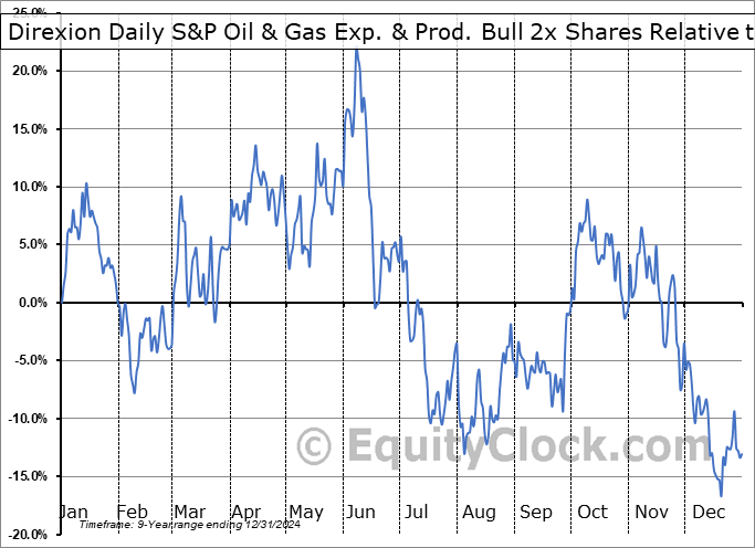 Analysis of the Direxion Daily S&P Oil & Gas Exp. & Prod. Bull 2x Shares (AMEX:GUSH) seasonal charts above shows that a Buy Date of March 18 and a Sell Date of June 8 has resulted in a geometric average return of 22.54% above the benchmark rate of the S&P 500 Total Return Index over the past 9 years. This seasonal timeframe has shown positive results compared to the benchmark in 6 of those periods. This is a good rate of success and the return strongly outperforms the relative buy-and-hold performance of the stock over the past 9 years by an average of 70.71% per year.