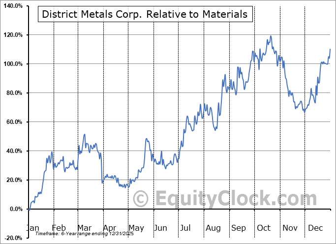 Analysis of the District Metals Corp. (TSXV:DMX.V) seasonal charts above shows that a Buy Date of November 29 and a Sell Date of March 22 has resulted in a geometric average return of 85.17% above the benchmark rate of the S&P 500 Total Return Index over the past 5 years. This seasonal timeframe has shown positive results compared to the benchmark in 5 of those periods. This is an excellent rate of success and the return strongly outperforms the relative buy-and-hold performance of the stock over the past 5 years by an average of 70.96% per year.