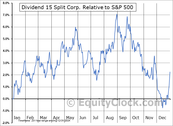 Analysis of the Dividend 15 Split Corp. (TSE:DFN.TO) seasonal charts above shows that a Buy Date of December 13 and a Sell Date of April 30 has resulted in a geometric average return of 5.37% above the benchmark rate of the S&P 500 Total Return Index over the past 20 years. This seasonal timeframe has shown positive results compared to the benchmark in 17 of those periods. This is a very good rate of success and the return strongly outperforms the relative buy-and-hold performance of the stock over the past 20 years by an average of 8.16% per year.