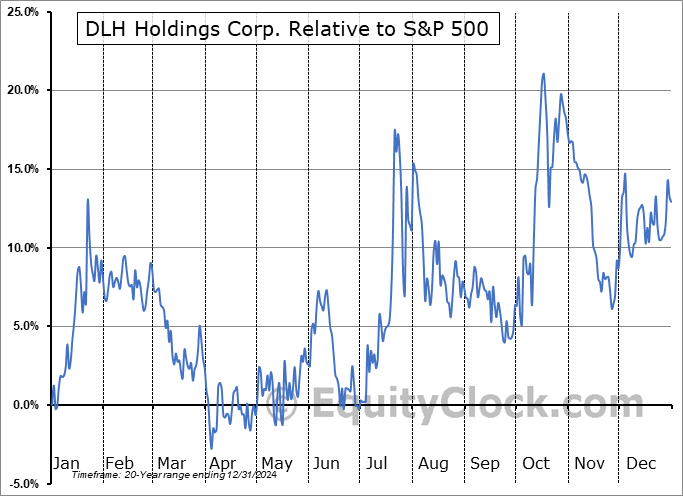 Analysis of the DLH Holdings Corp. (NASD:DLHC) seasonal charts above shows that a Buy Date of September 28 and a Sell Date of January 22 has resulted in a geometric average return of 6.69% above the benchmark rate of the S&P 500 Total Return Index over the past 20 years. This seasonal timeframe has shown positive results compared to the benchmark in 13 of those periods. This is a good rate of success and the return strongly outperforms the relative buy-and-hold performance of the stock over the past 20 years by an average of 15.74% per year.