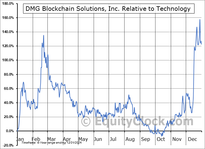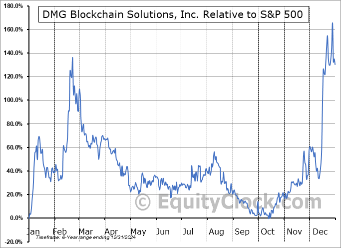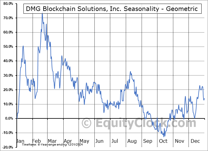 Analysis of the DMG Blockchain Solutions, Inc. (OTCMKT:DMGGF) seasonal charts above shows that a Buy Date of December 17 and a Sell Date of March 28 has resulted in a geometric average return of 46.96% above the benchmark rate of the S&P 500 Total Return Index over the past 6 years. This seasonal timeframe has shown positive results compared to the benchmark in 6 of those periods. This is an excellent rate of success and the return strongly outperforms the relative buy-and-hold performance of the stock over the past 6 years by an average of 50.8% per year.