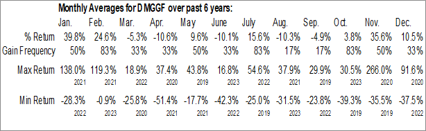 A word of caution: Only 6 years of data is available for shares of DMGGF, perhaps insufficient to create a seasonal profile that accurately gauges the seasonal tendencies influencing the investment. Ideally, while 20 years is preferred, at least 10 years of data is required to perform a seasonal analysis that is considered to be reliable for future seasonal periods.