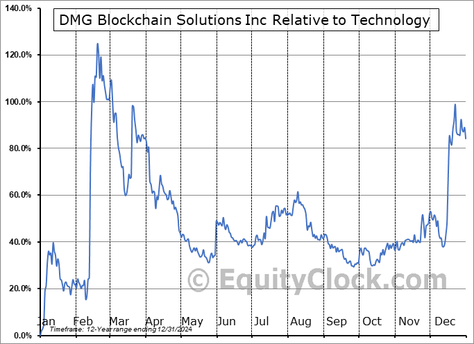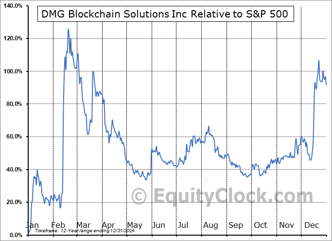 Analysis of the DMG Blockchain Solutions Inc (TSXV:DMGI.V) seasonal charts above shows that a Buy Date of December 6 and a Sell Date of March 28 has resulted in a geometric average return of 42.65% above the benchmark rate of the S&P 500 Total Return Index over the past 12 years. This seasonal timeframe has shown positive results compared to the benchmark in 8 of those periods. This is a good rate of success and the return strongly outperforms the relative buy-and-hold performance of the stock over the past 12 years by an average of 47.09% per year.