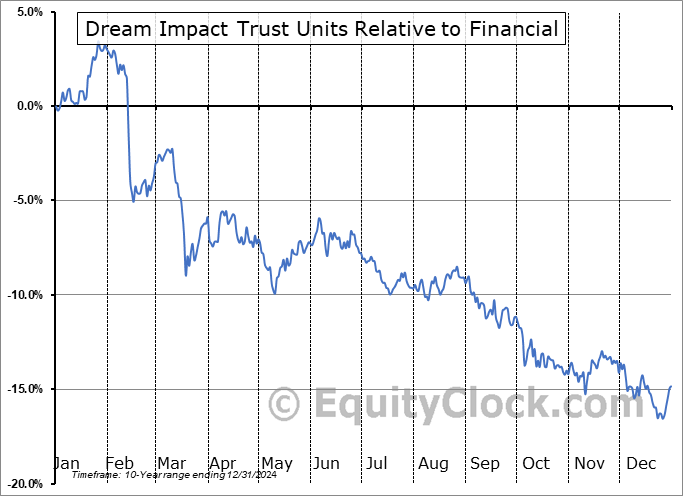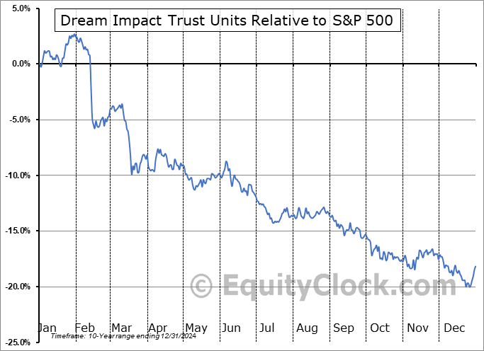 Analysis of the Dream Impact Trust Units (TSE:MPCT/UN.TO) seasonal charts above shows that a Buy Date of November 11 and a Sell Date of January 31 has resulted in a geometric average return of 2.4% above the benchmark rate of the S&P 500 Total Return Index over the past 10 years. This seasonal timeframe has shown positive results compared to the benchmark in 7 of those periods. This is a good rate of success and the return strongly outperforms the relative buy-and-hold performance of the stock over the past 10 years by an average of 25.3% per year.