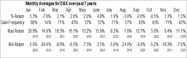 A word of caution: Only 6 years of data is available for shares of DBX, perhaps insufficient to create a seasonal profile that accurately gauges the seasonal tendencies influencing the investment. Ideally, while 20 years is preferred, at least 10 years of data is required to perform a seasonal analysis that is considered to be reliable for future seasonal periods.