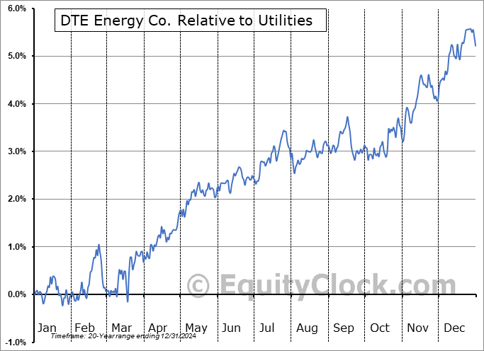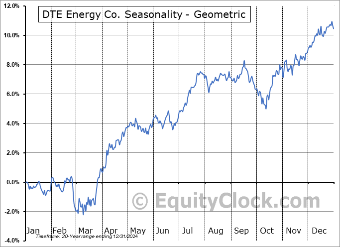 Analysis of the DTE Energy Co. (NYSE:DTE) seasonal charts above shows that a Buy Date of March 5 and a Sell Date of August 1 has resulted in a geometric average return of 2.55% above the benchmark rate of the S&P 500 Total Return Index over the past 20 years. This seasonal timeframe has shown positive results compared to the benchmark in 16 of those periods. This is a very good rate of success and the return strongly outperforms the relative buy-and-hold performance of the stock over the past 20 years by an average of 2.42% per year.