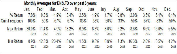 A word of caution: Only 6 years of data is available for shares of ENS.TO, perhaps insufficient to create a seasonal profile that accurately gauges the seasonal tendencies influencing the investment. Ideally, while 20 years is preferred, at least 10 years of data is required to perform a seasonal analysis that is considered to be reliable for future seasonal periods.
