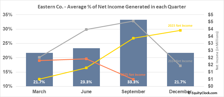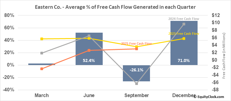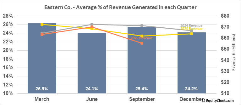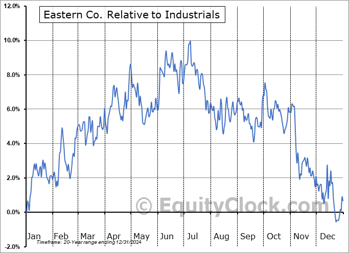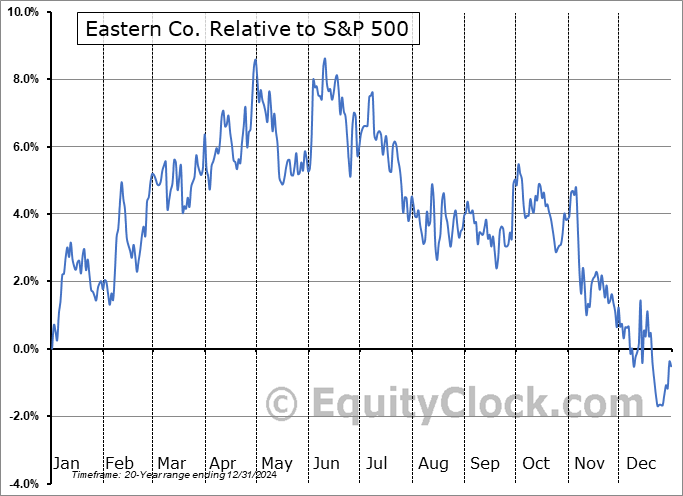 Analysis of the Eastern Co. (NASD:EML) seasonal charts above shows that a Buy Date of December 23 and a Sell Date of March 13 has resulted in a geometric average return of 5.33% above the benchmark rate of the S&P 500 Total Return Index over the past 20 years. This seasonal timeframe has shown positive results compared to the benchmark in 16 of those periods. This is a very good rate of success and the return strongly outperforms the relative buy-and-hold performance of the stock over the past 20 years by an average of 9.5% per year.