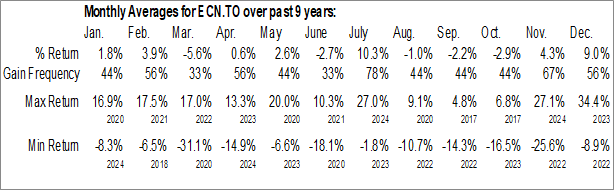 A word of caution: Only 9 years of data is available for shares of ECN.TO, perhaps insufficient to create a seasonal profile that accurately gauges the seasonal tendencies influencing the investment. Ideally, while 20 years is preferred, at least 10 years of data is required to perform a seasonal analysis that is considered to be reliable for future seasonal periods.