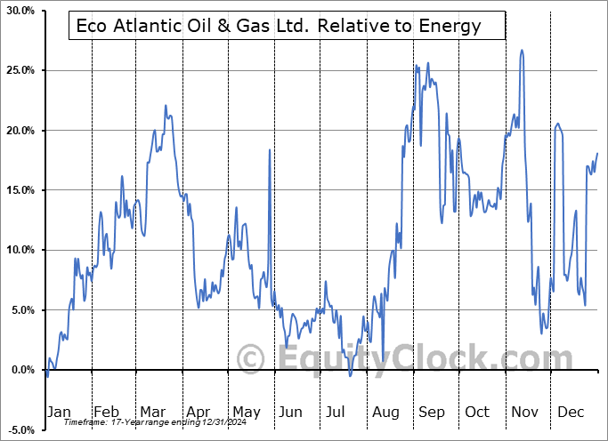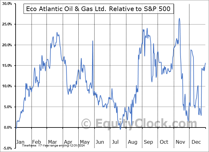 Analysis of the Eco Atlantic Oil & Gas Ltd. (TSXV:EOG.V) seasonal charts above shows that a Buy Date of December 19 and a Sell Date of March 22 has resulted in a geometric average return of 17% above the benchmark rate of the S&P 500 Total Return Index over the past 17 years. This seasonal timeframe has shown positive results compared to the benchmark in 13 of those periods. This is a good rate of success and the return strongly outperforms the relative buy-and-hold performance of the stock over the past 17 years by an average of 31.75% per year.