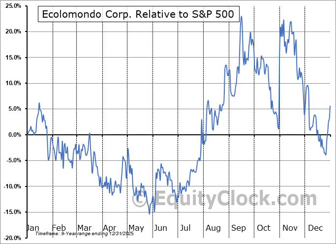 Analysis of the Ecolomondo Corp. (TSXV:ECM.V) seasonal charts above shows that a Buy Date of May 25 and a Sell Date of September 15 has resulted in a geometric average return of 30.1% above the benchmark rate of the S&P 500 Total Return Index over the past 8 years. This seasonal timeframe has shown positive results compared to the benchmark in 5 of those periods. This is a fair rate of success and the return strongly outperforms the relative buy-and-hold performance of the stock over the past 8 years by an average of 41.36% per year.