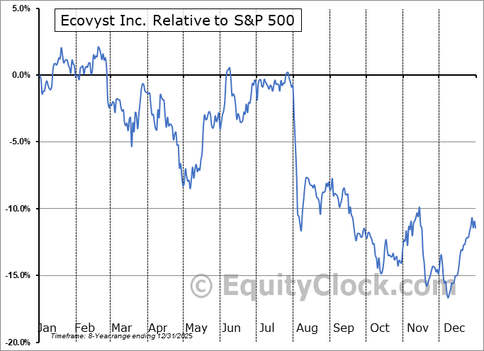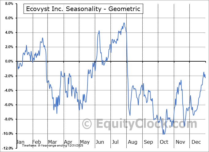 Analysis of the Ecovyst Inc. (NYSE:ECVT) seasonal charts above shows that a Buy Date of March 18 and a Sell Date of July 2 has resulted in a geometric average return of 2.63% above the benchmark rate of the S&P 500 Total Return Index over the past 8 years. This seasonal timeframe has shown positive results compared to the benchmark in 6 of those periods. This is a good rate of success and the return strongly outperforms the relative buy-and-hold performance of the stock over the past 8 years by an average of 16.96% per year.