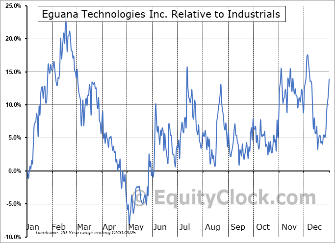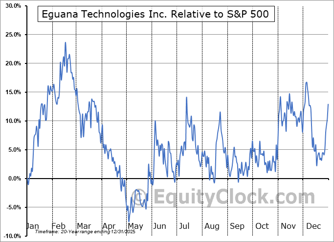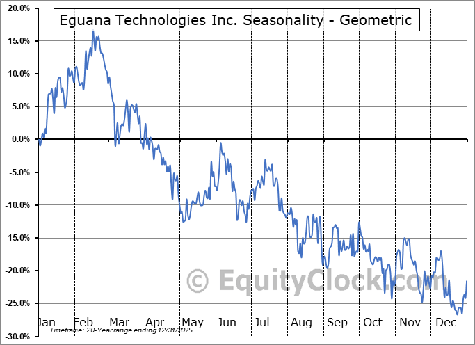 Analysis of the Eguana Technologies Inc. (TSXV:EGT.V) seasonal charts above shows that a Buy Date of December 21 and a Sell Date of March 19 has resulted in a geometric average return of 10.84% above the benchmark rate of the S&P 500 Total Return Index over the past 20 years. This seasonal timeframe has shown positive results compared to the benchmark in 13 of those periods. This is a good rate of success and the return strongly outperforms the relative buy-and-hold performance of the stock over the past 20 years by an average of 40.05% per year.
