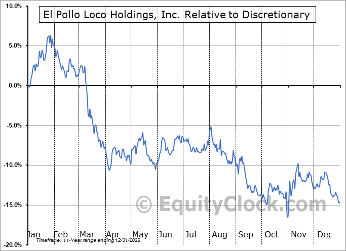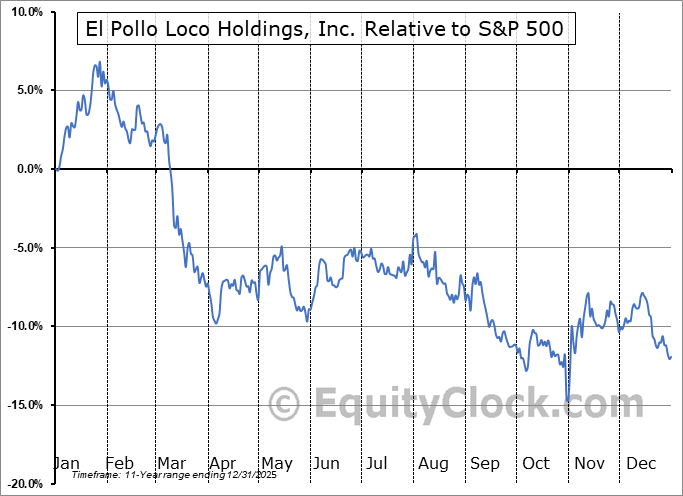 Analysis of the El Pollo Loco Holdings, Inc. (NASD:LOCO) seasonal charts above shows that a Buy Date of October 6 and a Sell Date of December 26 has resulted in a geometric average return of 2.94% above the benchmark rate of the S&P 500 Total Return Index over the past 11 years. This seasonal timeframe has shown positive results compared to the benchmark in 7 of those periods. This is a fair rate of success and the return strongly outperforms the relative buy-and-hold performance of the stock over the past 11 years by an average of 18.83% per year.